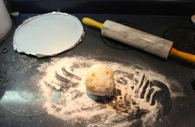 Cuando se usa una piedra, sólo espolvorear un poco de harina en la superficie para evitar que se pegue. Cualquier chapa metálica tradicional de pan o galleta (o en papel de aluminio como lo estoy haciendo) frote un poco de mantequilla sobre la superficie, luego Espolvoree harina sobre eso. Se puede ver en la segunda foto de arriba que esto crea una capa de harina en la sartén.