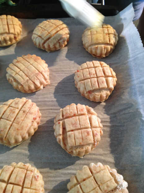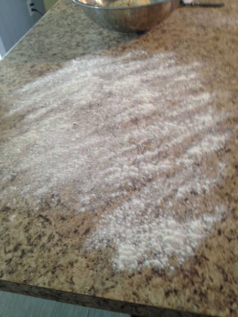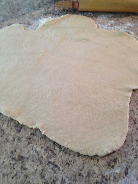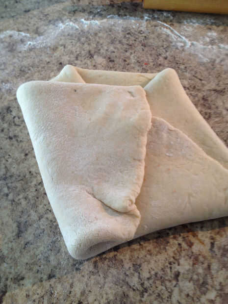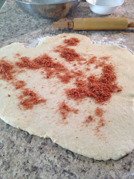 Espolvorear la masa rectangular con abundante cantidad de tocino molido, otra vez tire doblar, rodar otra vez plana al rectángulo y deje reposar cubierto durante 20 minutos.