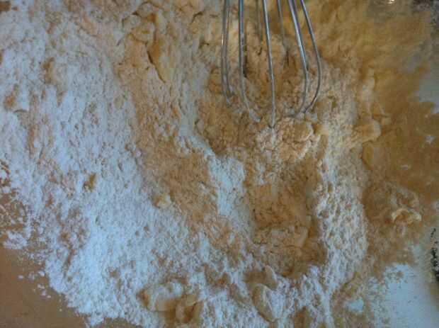 Puede utilizar un batidor y simplemente jab en la mezcla hasta que quede la consistencia de arena grumosa espesa (como usted está haciendo una tarta)