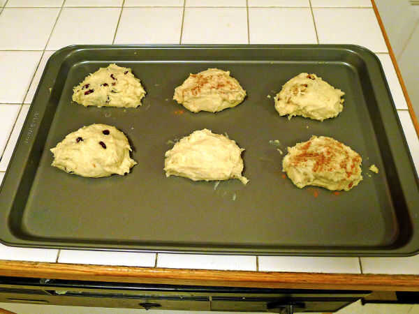 Un divertido con sus bollos cabe añadir ingredientes adicionales a cada puñado de masa. Simplemente tome un puñado de masa y un puñado de ingredientes extras (consulte el paso final para ideas), mezcle en las manos, forma y colocar en la bandeja. También podría intentar rodar tu masa en azúcar gruesa o azúcar morena.