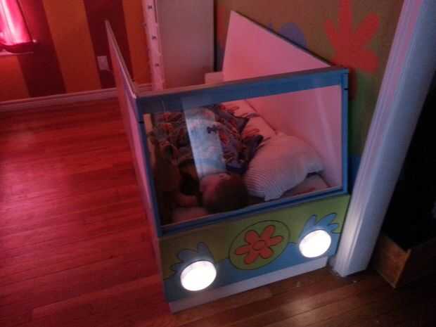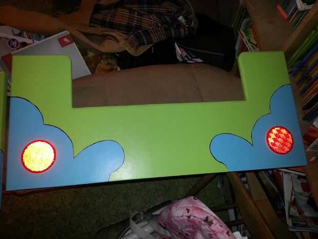 Usé pintura para delinear todo, whoa!!! tedioso. Búscate un marcador, yo hice algunos retoques como esta y de que manera más fácil. Los reflectores rojos son peal y palillo para que instalación fue una brisa. La lámpara de empuje necesita pelar y pegar Velcro, para que pueda cambiar las pilas. Por último consigue al niño para dormir y tal vez unas pegatinas. Espero que te ha gustado este instuctable.