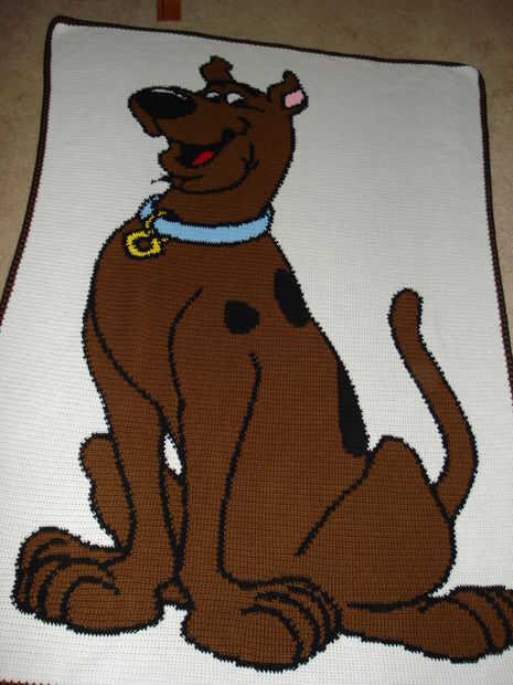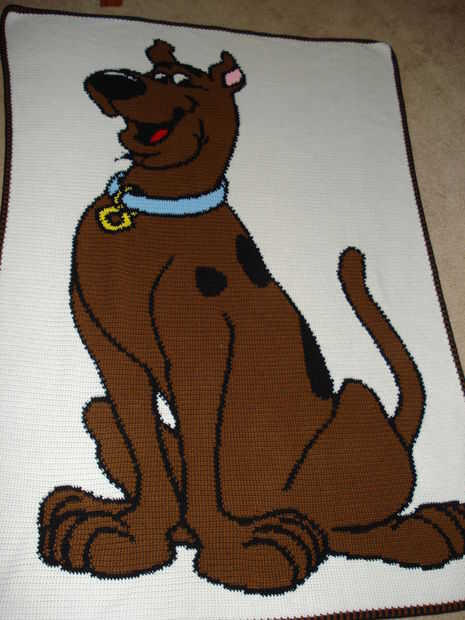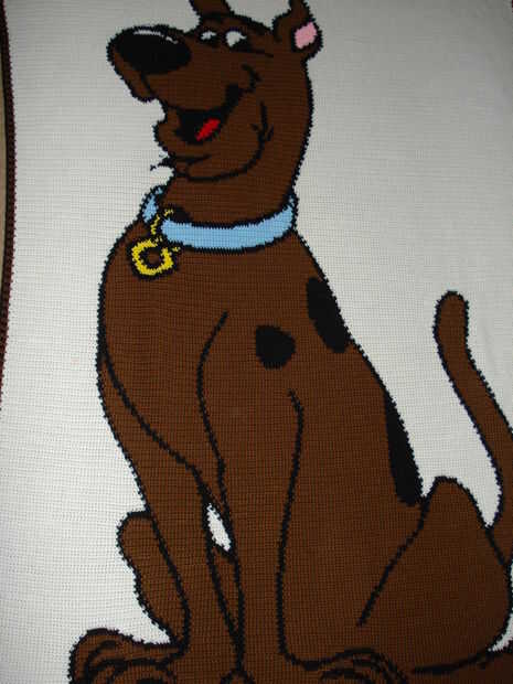 Este es mi favorito afgano que he hecho. La hice para el cumpleaños 4 de mi hijo. Él quería una fiesta temática de scooby y una manta de scooby. Así que hice esta usando un gancho G, hilado de 4 capas y un gráfico. Se realiza en punto bajo. Es un afgano de tamaño doble. Era muy desperdiciador de tiempo. Yo de ganchillo bastante rápido y esto me tomó dos meses para terminar.