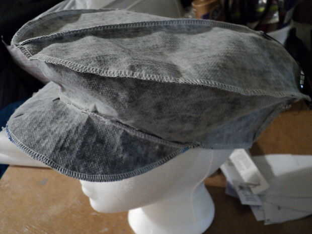 Marque el centro de la pieza de borde de referencia. Ser hasta la parte central del sombrero. Serge alrededor para fijar la pieza del ala del sombrero.