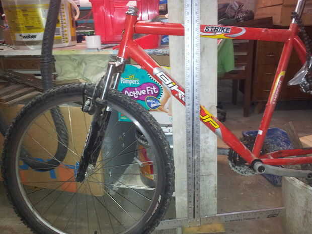 Levantó el marco con una rueda en su lugar, la parte trasera y poner un tablero detrás para trazar los ángulos. Tomar un cuadrado de yeso grande T y ponerlo boca abajo para que usted ahora puede trazar aproximadamente la marca de su altura. Deja un poco extra de la pipa cortaron. Era una fracción corta yo. Entonces puede empezar a pensar cómo se están poniendo todos juntos.