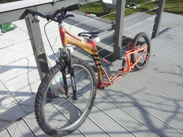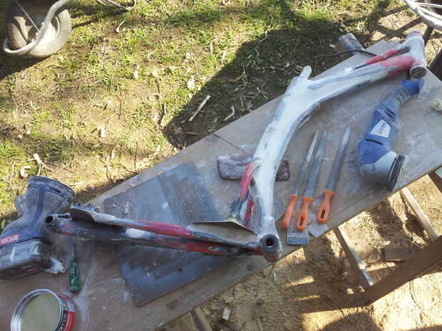 Mi cuñado le dio una prueba de conducción y el marco quebró justo en el centro de la pipa más baja... así que rewelded, reforzado y añadió una pipa más pequeña y gussett al original. También he añadido el seatpole y algunos de los pedacitos difíciles como el guardabarros trasero que le ventilador en. La soldadura fue un desastre así que optó por carbog / bondo suavizado como se muestra. Un trabajo spray y etiqueta personalizado.