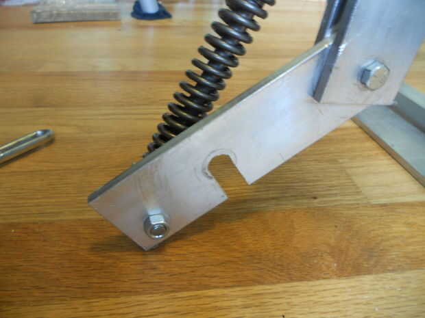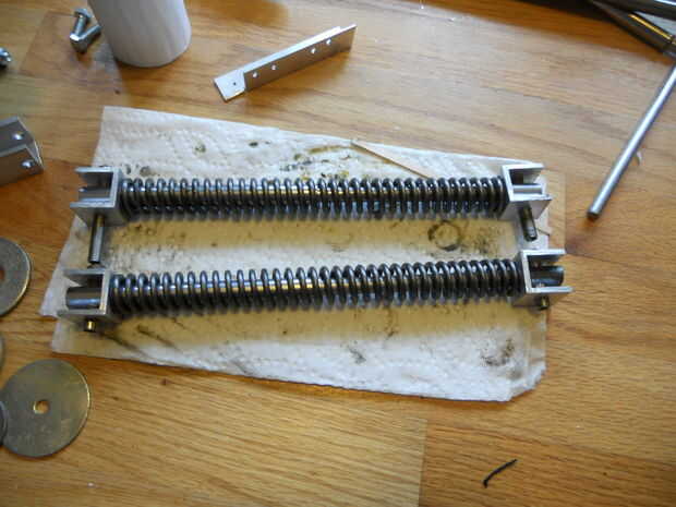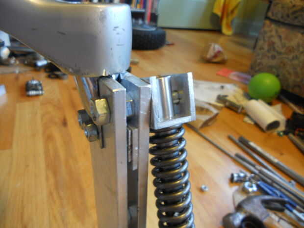 Tiró los resortes y amortiguadores de la horquilla de bicicleta de montaña y usado para crear un nuevo par de amortiguadores con pivotes en cada extremo. Los pivotes me permitieron construir un brazo de suspensión estilo de enlace principal, que es mucho más fácil de construir que un tenedor telescópico.