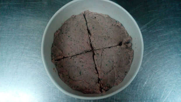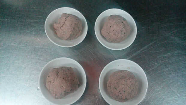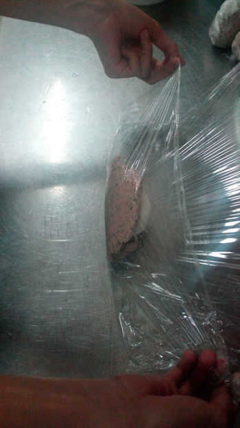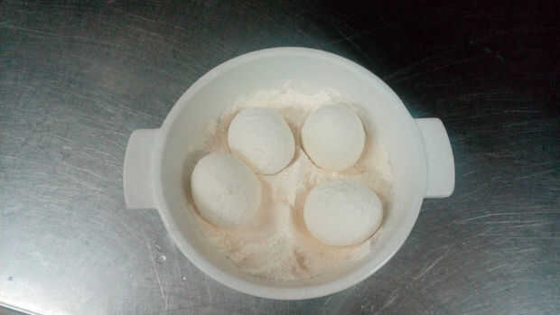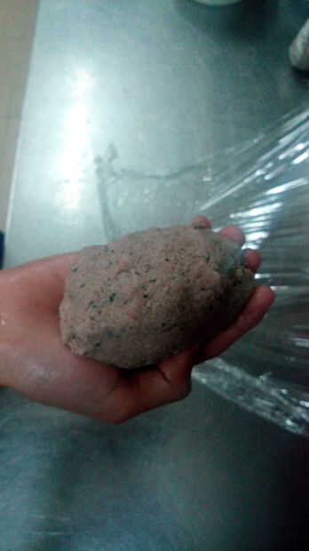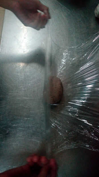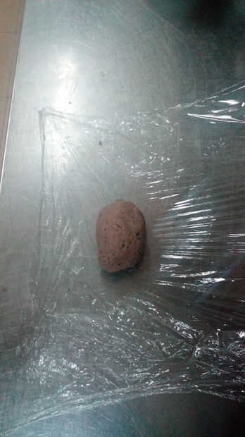 ~ Luego dividir en 4 bolas iguales. Aplastar una de las bolas entre un pedazo de la flm se aferra hasta que esté tan gorda como sea posible y de forma ovalada.