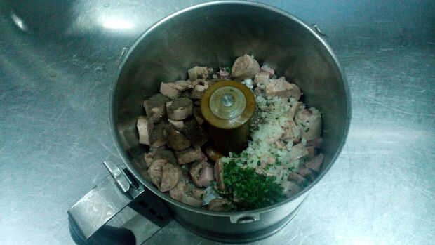 ~ Poner la carne picada, pimiento, cebolla y hierbas en procesador de alimentos mezcla para combinar,
