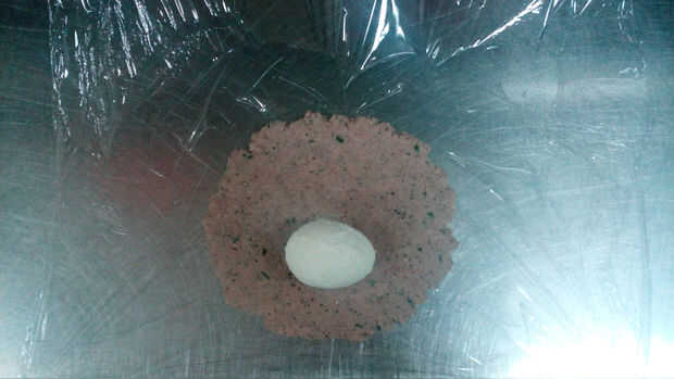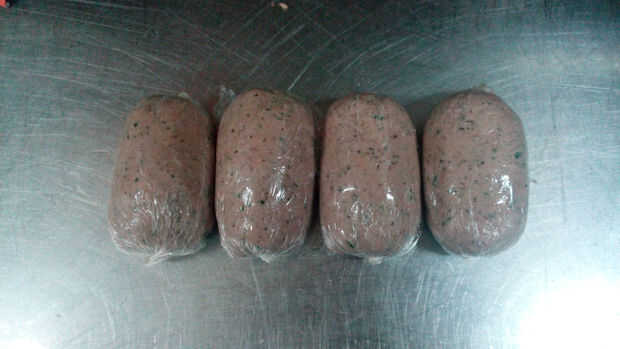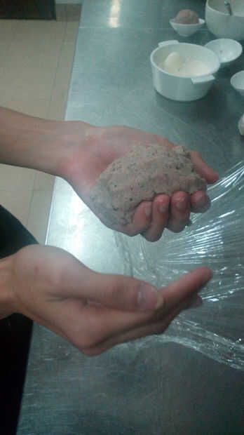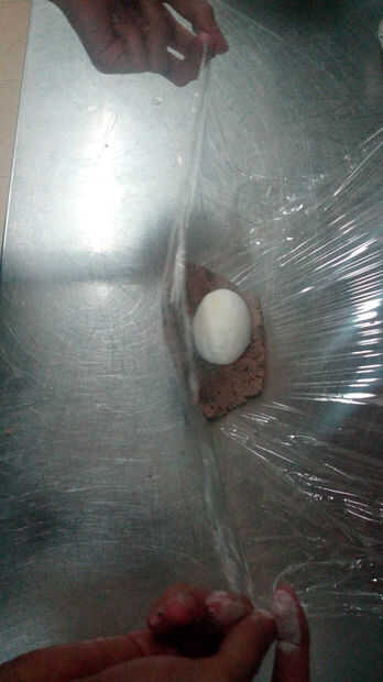 ~ Uno a la vez, ligeramente cuatro cada uno cocido el huevo, luego use el flm se aferran a rodar el sausagemeat alrededor del huevo para encajonar totalmente. Repita con el resto sausageballs y huevos.