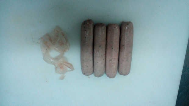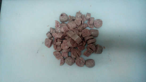 ~ Pelar la piel sausagemeat, luego se corta en trozos más pequeños con jamón