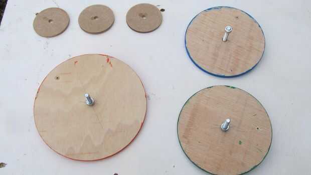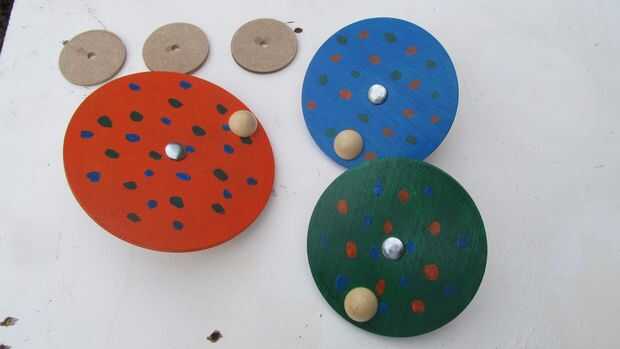 3 disco de madera de colores y pintado con pintura de protección transparente.
