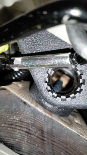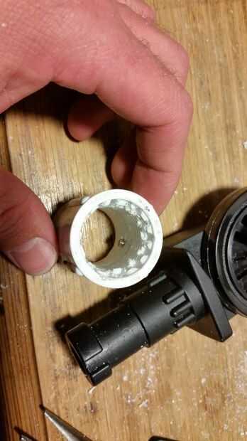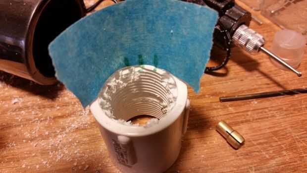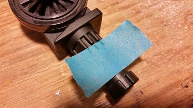 Ahora cortamos las ranuras en la parte superior del acoplamiento para evitar que el soporte de la varilla gire libremente. Estoy seguro que hay mejores métodos pero simplemente tomé un trozo de cinta y había marcado la ubicación de la base de soporte de la varilla la cinta y luego transcribe para el acoplamiento. Cortan las ranuras con una herramienta Dremel. No resultan muy bonita pero funciona. Comprobar el acoplamiento insertando la base del soporte de la barra. Bloqueo en rotándola y luego asentarlo en las ranuras. Debe ser bastante ceñido.