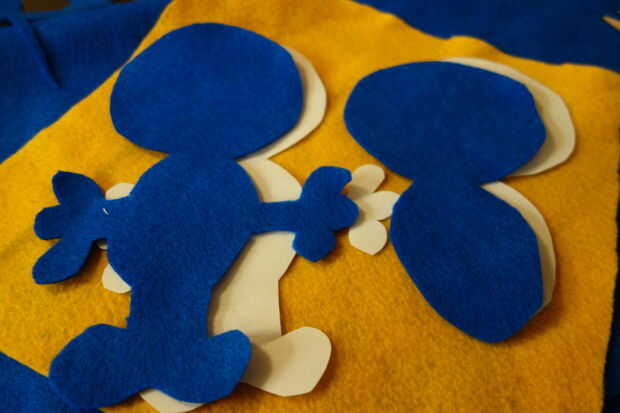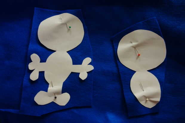 En este paso crearemos una segunda pieza de patrón tomando una de las piezas del patrón y cortando los brazos y las piernas. Coloque la pieza nueva sobre el azul o el fieltro de color caqui. Prender y cortar en fieltro.