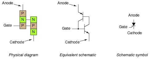SCRs y GTOs compartan los mismos esquemas equivalentes (dos transistores conectados en forma de retroalimentación positiva), las únicas diferencias siendo detalles de construcción diseñados para otorgar el transistor NPN un β mayor de la PNP. Esto permite una menor corriente de puerta (avance o retroceso) a ejercer un mayor grado de control sobre la conducción del cátodo al ánodo, con estado enganchado del transistor PNP depende más de la NPN que viceversa. El tiristor de puerta-Turn-Off también es conocido con el nombre de Gate-Controlled interruptor o GCS.