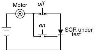 El normalmente abierto "on" el interruptor de botón de impulsión conecta la puerta al ánodo, a través de la ensambladura del PN cátodo-gate, a través del interruptor, a través del resistor de carga, permitiendo que la corriente desde el terminal negativo de la batería y de nuevo a la batería. Esta corriente de la puerta debe forzar el SCR sujetarlos, permitiendo que la corriente para ir directamente de cátodo a ánodo sin que se dispare aún más a través de la puerta. Cuando se suelta el botón de "on", la carga debe permanecer energizada.