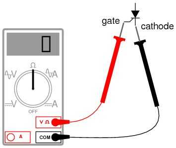 Una rudimentaria prueba de función SCR o identificación terminal por lo menos, puede realizarse con un ohmetro. Debido a la conexión interna entre puerta y cátodo es una sola ensambladura del PN, un medidor debe indicar conductor de continuidad entre estos terminales con la punta de prueba roja en la puerta y la negra en el cátodo como este (Fig. 2)
