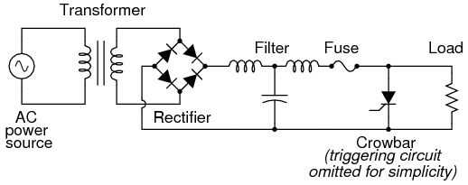 Otro uso práctico de lo SCR en circuitos de DC es como un dispositivo de palanca para la protección de la sobretensión. Un circuito de "palanca" consiste en un SCR en paralelo con la salida de una fuente de corriente continua, para la colocación directa del cortocircuito en la salida de esa fuente para evitar exceso de tensión llegue a la carga. Daño a los SCR y poder suministro es prevenido por la juiciosa colocación de un fusible o resistencia importante por delante de la SCR para limitar la corriente de cortocircuito: (Figura 6)