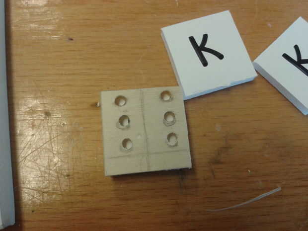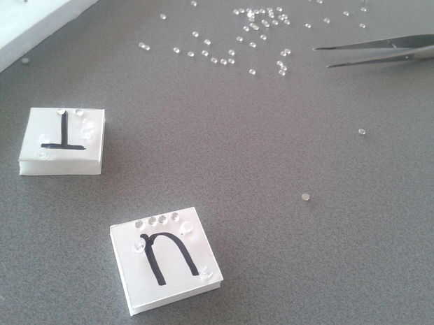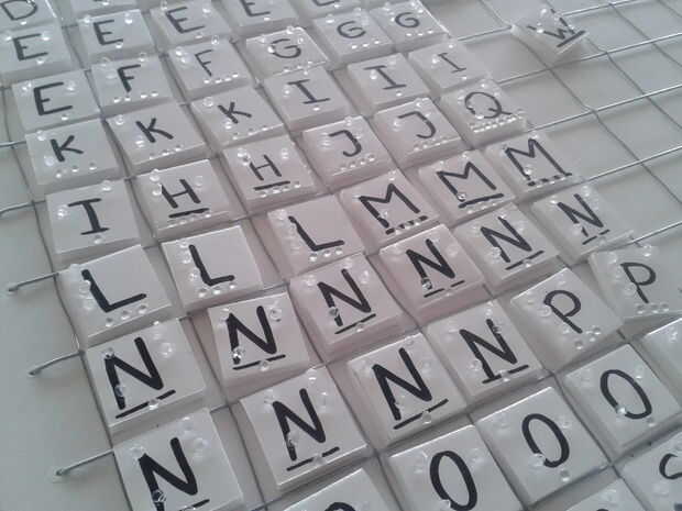 Con los granos más grandes haces el Braille en las cartas, con los granos más pequeños que indica la cantidad de puntos que la letra merece la pena. Los granos pequeños están en la parte inferior de cada carta.