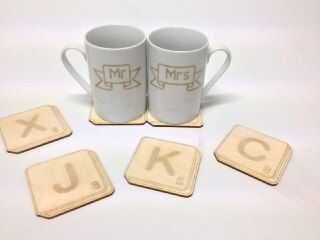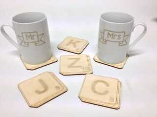 Mooching a través de las entradas del concurso boda vi el portavasos de madera grabado Laser.