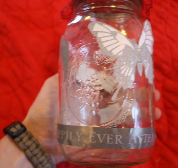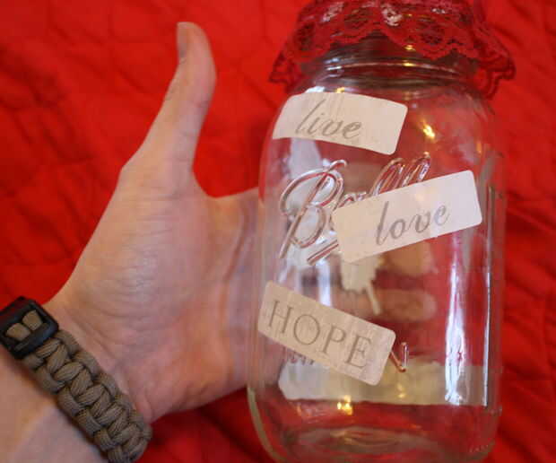 Yep, bastante auto explicativo. Añadir lo que quieras en el exterior, en mi caso, he usado etiquetas engomadas scrapbooking al azar que dicen cosas como "Amor" y "Fe" y "La esperanza".