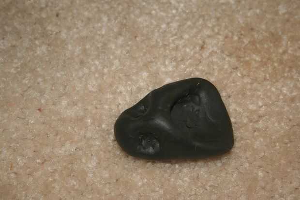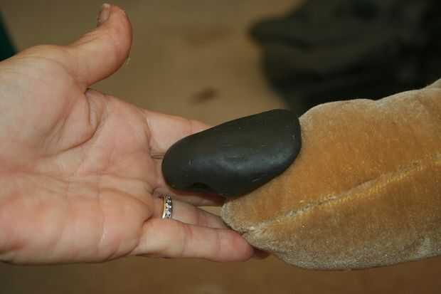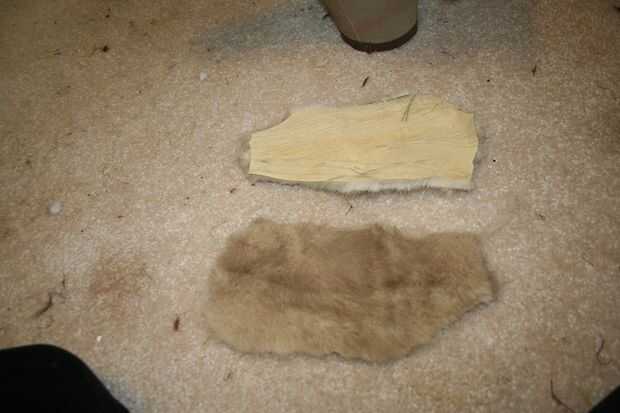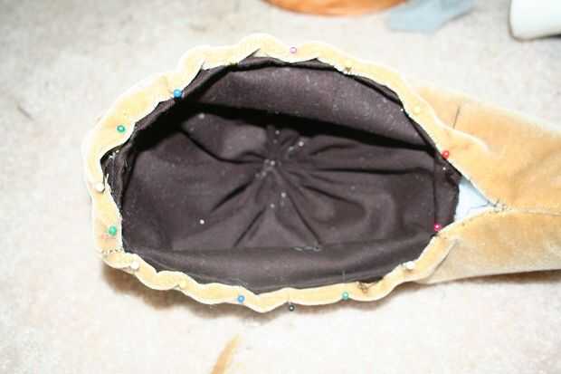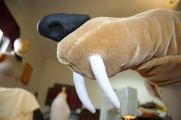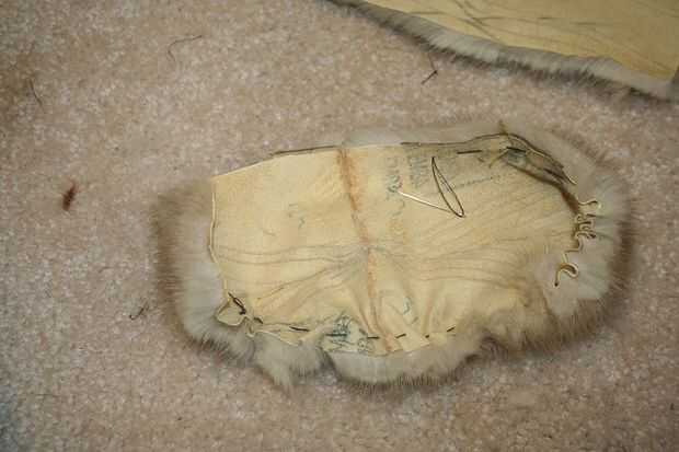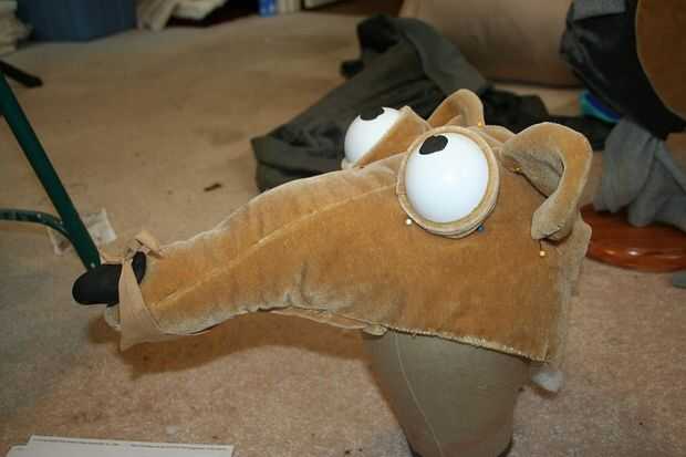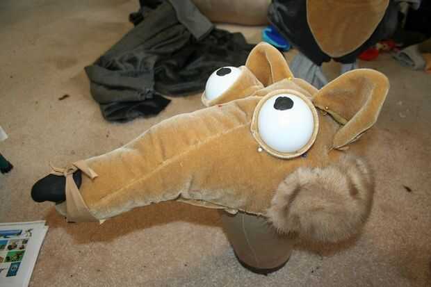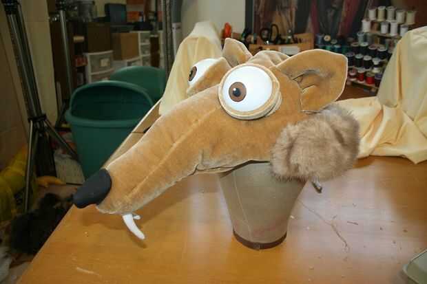 Las mejillas de Scrat están hechas de trozos de piel que he formado en pequeñas bolsas. Son rellenos y cosidos a los lados de la cabeza de la mano.