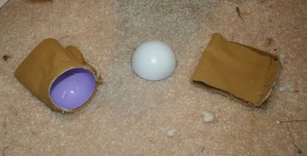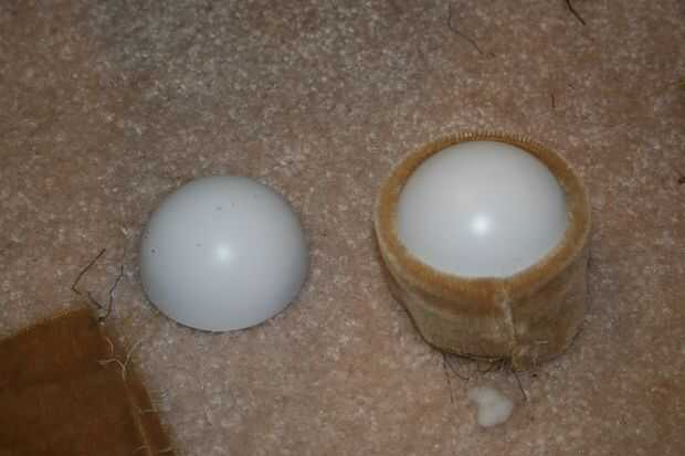 Hay dos tubos de tela que se utilizan para los zócalos del ojo. Los tubos se doblan por la mitad y dos redondas tapas de botellas (pueden utilizarse bolas) estaban pegados en los zócalos del ojo tela suavizante. Scrat tiene ojos saltones, así que deja mucha de la bola que sobresale de la toma. los ojos fueron pintados con pintura de acrílico artesanal. Los zócalos del ojo son mano cosida a la cabeza.