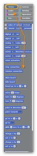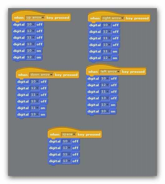 Nota es importante que todos los otros pines en off. La mejor manera de hacerlo es establecer todos los pines en off y luego encender los pernos requeridos para una dirección específica. Si nos fijamos en la imagen el código S4A, verá que he incluido un bloque para cada dirección con las flechas en el teclado y un bloque extra utilizando la barra espaciadora para detener toda la actividad.