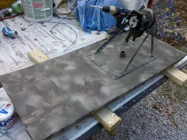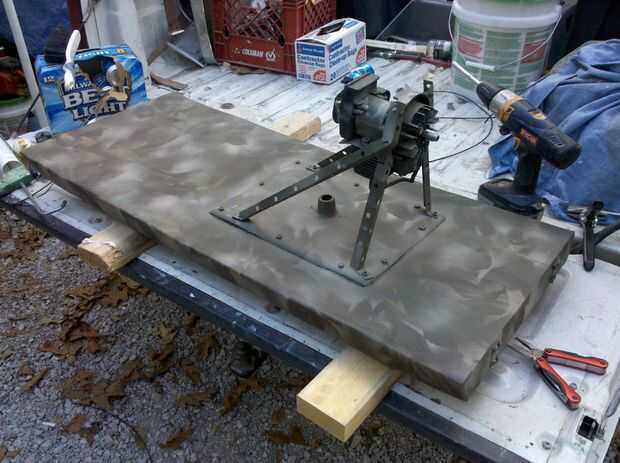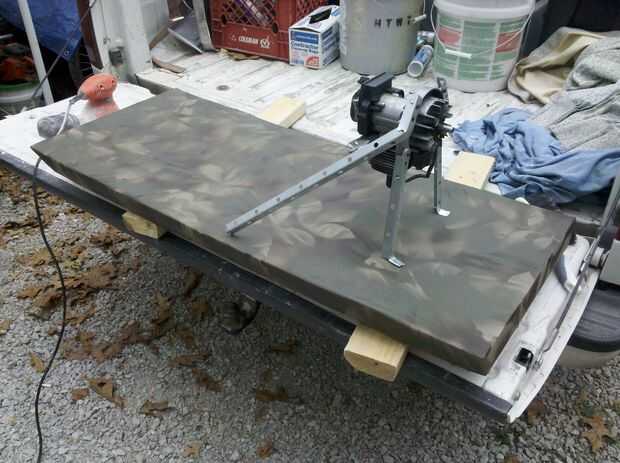 Usé caldo ligero ángulo perforado para atornillar el motor en un pedazo grande de láminas de PVC rígido que corte de un antiguo depósito de. Una vez que la configuración era de mi agrado, gorila pegado y atornillado el conjunto a la cubierta del barco justo detrás del punto medio del casco, asegurándose de que el eje de la hélice sería centrado y en paralelo con el barco una vez fijado.