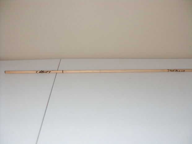 Lo primero que hacemos es medida por el pasador. nos da una idea aproximada donde todo va a ser espaciadas. también es fácil de poner todo en su lugar. La vaina del plano es de 200mm de longitud, el ala se monta encima de la cabina por lo que no toma espacio de pasador, el plano de cola (timón y elevador toma) hasta 50 mm del extremo de la espiga. Para un sentido del tamaño del componente, marca el tamaño de vaina y el tamaño del plano de cola en la espiga como en la foto. zoom para ver las marcas más claramente.