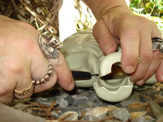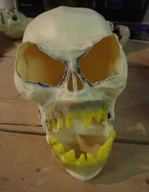 Finalmente tomé el cráneo, cortar los ojos, nariz y boca. Ahora tomar una pistola de calor y cuidadoY calentar el tramo plástico y (con los guantes de trabajo encendido) y forma la cara a cualquier aspecto que desee. Usé un conjunto de dientes falsos de la Dollar Tree para darle un aspecto tenebroso.