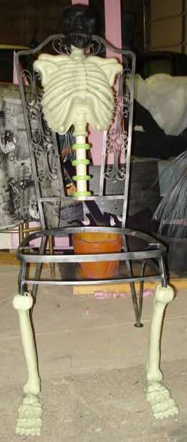 No quería dejar abierta la abertura inferior de la silla así que tomó un trozo de tubo de pvc y corte para que quepa entre la pequeña sección de la columna vertebral en el esqueleto y la barra inferior de la espalda de la silla. Luego tomó pedazos de tallarines de la piscina y pegada en el pvc para que se vea como una columna vertebral.