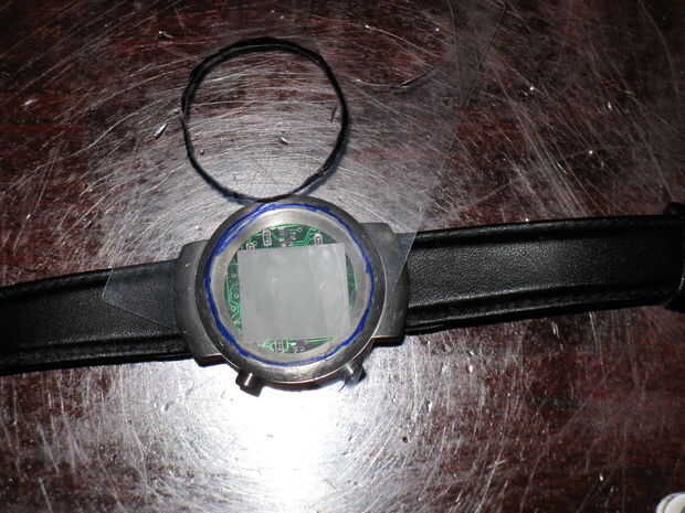 Con cuidado utilizando su marcador, dibuje alrededor del borde de la esfera del reloj, está tan cerca del cristal como sea posible, luego retire el screenguard y cinta del reloj. Usando tus tijeras, recorta el círculo. Esta parte es crucial: cuando corte, corte a la dentro de la línea le hizo. Si se corta en el exterior, será demasiado grande y se superponen el vidrio, y tienes que recortar. Corte en el interior de la línea debe darle exactamente el tamaño correcto.