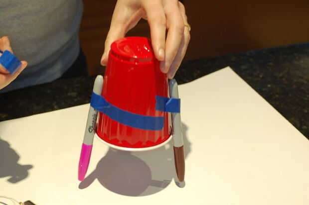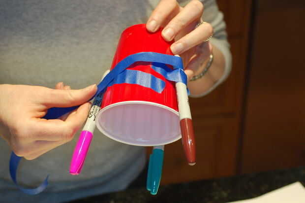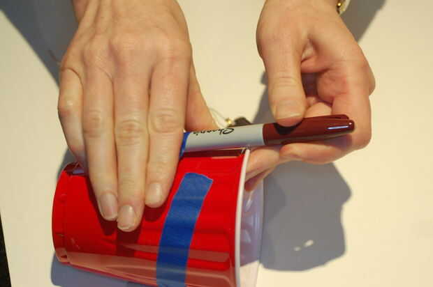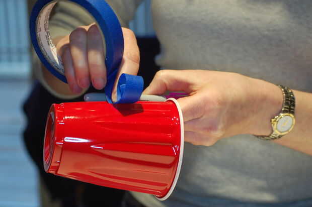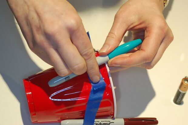 Fije los corrales como las piernas al cuerpo (taza, lata de soda, etc.) con la cinta (puede utilizar gomas también).