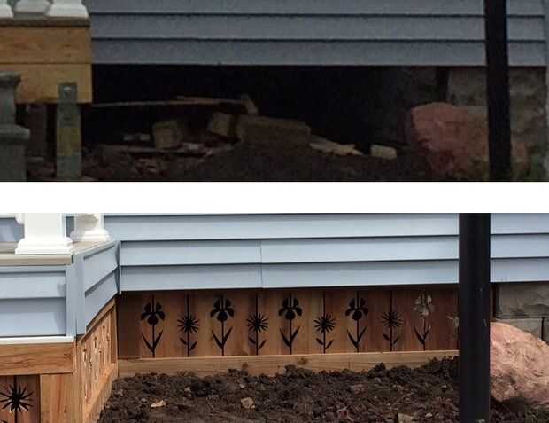 Construí un pequeño porche para mi hija y la casa de hija-en-ley y necesita algún tipo de bordear alrededor de él. Busqué alternativas a la del enrejado y vio que juntas se utilizan para ser usado con formas geométricas cortadas entre los tableros con huecos entre ellos. Me preguntaba si la misma idea trabajaría con flores, con la diferencia que sirve como la madre. Y así fue!