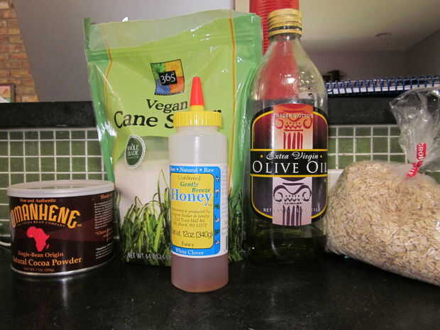 -1 taza de azúcar crudo -2 1/2 cucharadas de cacao en polvo -1/4 de taza de avena cruda -2 cucharadas de miel -1/8 cucharadita de vainilla -2 cucharaditas de aceite de oliva -un saludable toque de canela