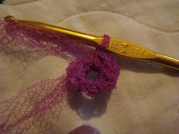 Sc8 en el centro del anillo.  No se contar filas o rondas, lo cuenta es cada sección de red entre cada nudo.  También, como llegar a cada nudo, necesitará asegurarse de que cada nudo está en el interior de los matorrales. Tiene 9 secciones y 8 nudos.