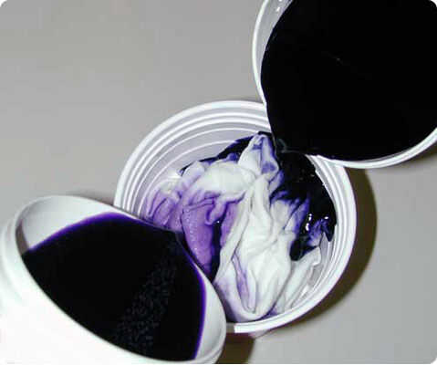 Paso 4: Con un envase de colorante en cada mano Vierta lentamente cantidades iguales de tinte hacia abajo de los lados opuestos de la Copa, llenando la taza casi al principio.