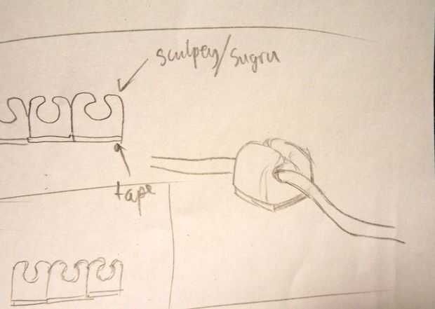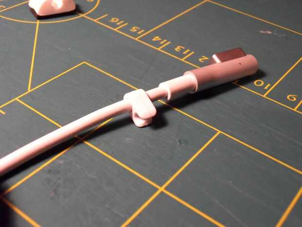 Entonces tuve la idea de hacer clips. Podía hacerlos de Sugru (sólo yo no tenía ninguno) o de cualquier plástico capaz de tallar. Finalmente usé Sculpey. Aunque Sculpey se convierte bastante duro después se cuece al horno, funciona muy bien como titular de la cuerda. Al principio pensé que debería ser un material flexible, pero el Sculpey demostró que el material duro funciona bien.