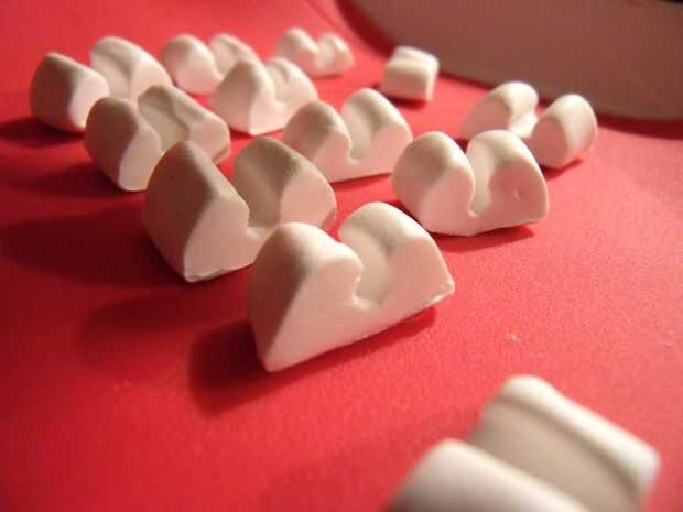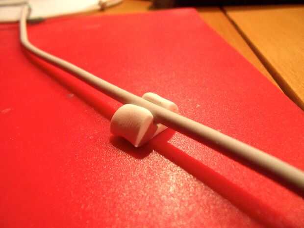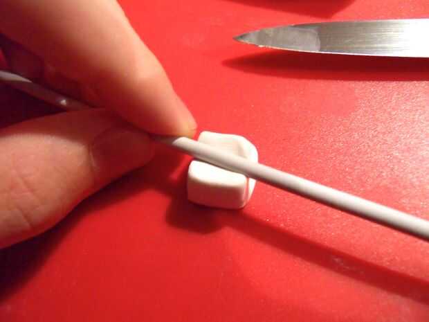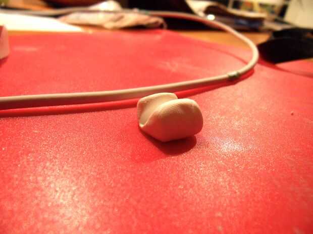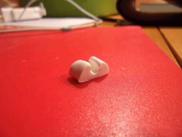 Usando Sculpey para hacerlo resultó para ser mucho más fácil de lo que esperaba. Para hacer un soporte, haz un pequeño cubo de Sculpey aproximadamente 1-2 ³ de centímetros. Luego tomar el cable y pulse en el bloque de Sculpey para crear la forma. Suavemente apriete la parte superior del soporte para que el cable te haz encerrado en su interior y que no se deslicen. Para que se vea bonito (no realmente añade a la funcionalidad), utilice un cuchillo o navaja para cortar los lados inclinados. Antes de poner los titulares en el horno para que endurezca, verifique que el cable se ajusta firmemente y no se deslice hacia fuera muy fácilmente. Continuación les dejamos endurecer en el horno durante 30 minutos, 110 º C.