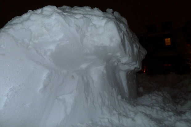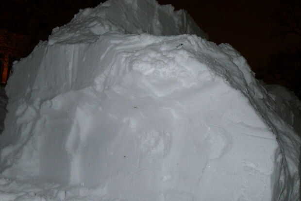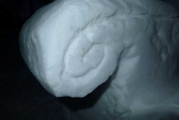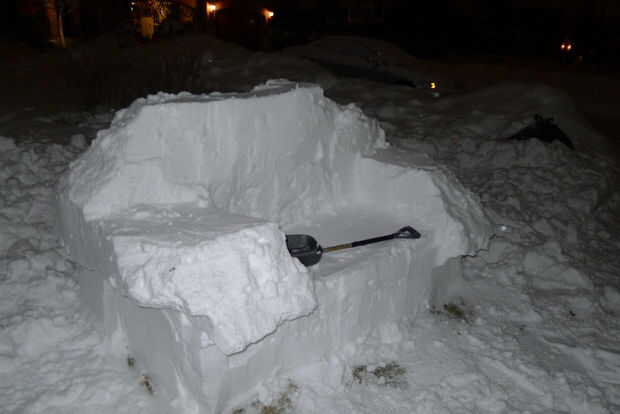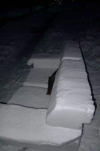 Una vez que tienes un bruto de talla de los brazos y el asiento, es hora de ponernos serios sobre la forma de los brazos. La altura del asiento por que se ha decidido dictará el punto final de los brazos y para mi diseño, el alero. Mis brazos empezaron muy amplia, pero terminó aproximadamente 1 pie de ancho, la mayoría de la nieve se toman desde el borde exterior, no el asiento. Mira las fotos finales para obtener una buena idea de las intersecciones entre el brazo, el asiento, el alero y la parte delantera. Es muy personalizable y se puede obtener una variedad de miradas. Con saliente, hay un gran riesgo de derrumbes porque no hay apoyo a los voladizos. Tener cuidado con esto y sacar trozos de nieve poco a poco con su sierra, nunca rascado en la nieve con algo contundente.