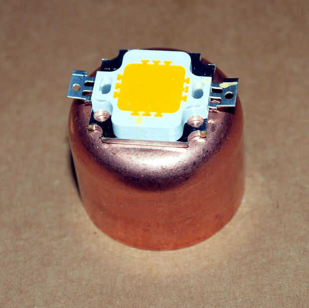 He estado trabajando mucho con LED últimamente y pensar que uno de estos pequeño 10 vatios que funcionaría perfecto para la luz de esto. Es pequeña y usa muy poca energía. El verdadero problema estaba tratando de averiguar cómo configurar un disipador de calor. A pesar de que esta luz tiene un uso de baja potencia que genera calor por lo que tiene tener un disipador de calor para evitar que se queme. Se me ocurrió que podría usar un tubo de cobre, a la izquierda sobre el tubo de agua, a montar el LED y extraer calor. El cobre es un metal muy buen disipador de calor por lo que debe ser adecuada para el trabajo.