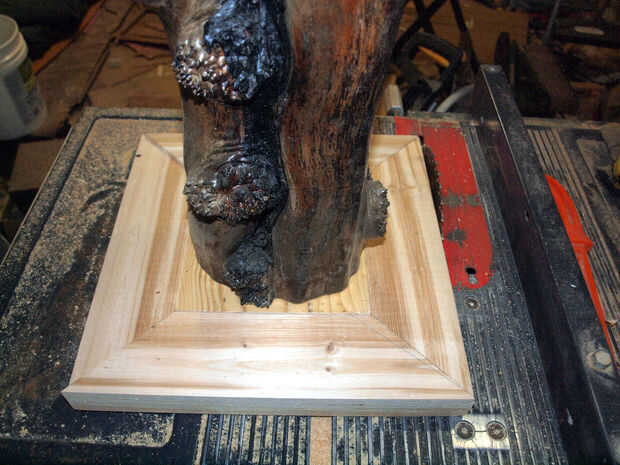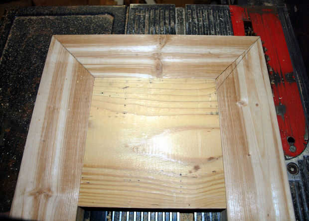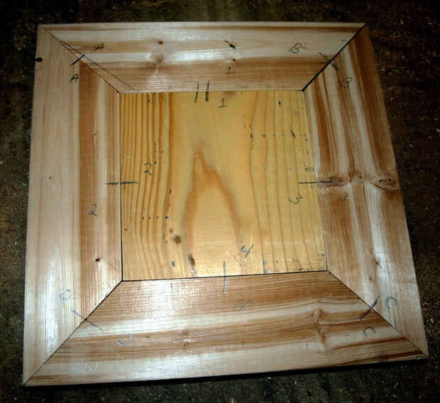 Tuve un 2 x 4 que tenía algún grano de aspecto interesante. Mirando al final pude ver que fue cortado del centro del árbol. Esto a veces puede ser un problema ya que este tipo de cosas puede deformar o separar. Para ayudar a minimizar este riesgo y también porque se ve cool me decidí a inglete corte las esquinas. Así que tuve una pieza cuadrada grande para la media con piezas a inglete alrededor.