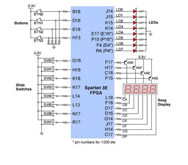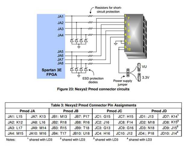 En la Xilinx I/O pin planificación, asignamos las entradas y salidas según las salidas de pin en las imágenes. En las imágenes de arriba, los pines se pueden encontrar para los interruptores, LEDs integrados, botones y los autobuses Pmod. Conectar los LEDs externos a los autobuses de Pmod es un poco diferente, así que aquí tenéis una pequeña guía para ayudar a conectarlos correctamente: