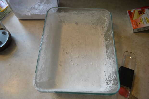 Rocíe un metal de 13 por 9 pulgadas para hornear con aceite antiadherente en aerosol. Añadir la mezcla de azúcar y almidón de maíz y moverse para cubrir completamente el fondo y los lados de la cacerola. Devolver el resto de la mezcla al recipiente para su uso posterior.