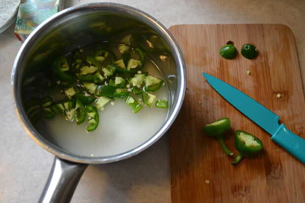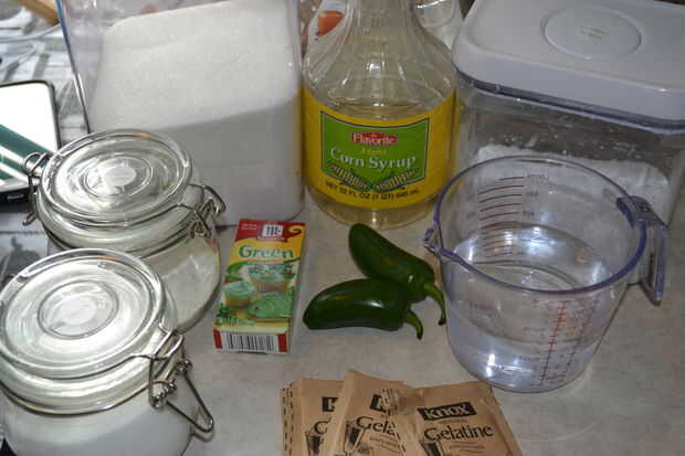 Colocar la gelatina en el bol de una batidora junto con 1/2 taza de agua. Tienen la posición de accesorio batidor por. Áspero, pica los jalapeños, cortar secciones de cuartos está muy bien.Combinar el azúcar y la maicena en un tazón pequeño.