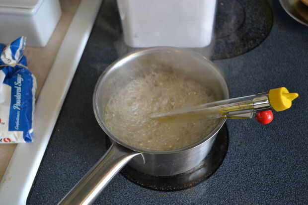 Cuando esté listo, vierta la mezcla en el molde que preparaste, usando una espátula ligeramente aceitada para difundir uniformemente en la bandeja. Espolvorear la parte superior con suficiente de la mezcla de azúcar y la maicena restante para cubrir ligeramente. Reserva el resto para más adelante. Permiten las melcochas se siente descubierto durante al menos 4 horas y hasta durante la noche.