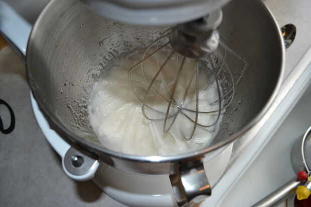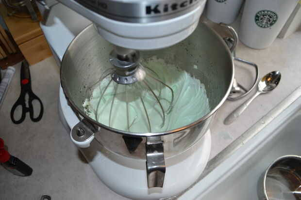 Encienda el mezclador de baja velocidad y, mientras están en funcionamiento, Vierta lentamente el jarabe de azúcar, a través de un colador, quitar los jalapeños, abajo del lado del tazón de fuente en la mezcla de gelatina. Una vez que haya agregado todo el almíbar, aumentar la velocidad a alta. Continuar a batir hasta que la mezcla se vuelve muy espesa y tibia, aproximadamente 12 a 15 minutos. Añadir la vainilla y colorante de alimentos durante el último minuto de azotes. Mientras es batir la mezcla prepara las cacerolas de la siguiente manera.