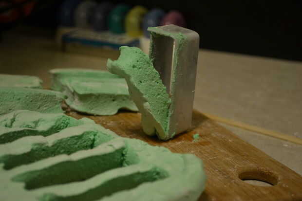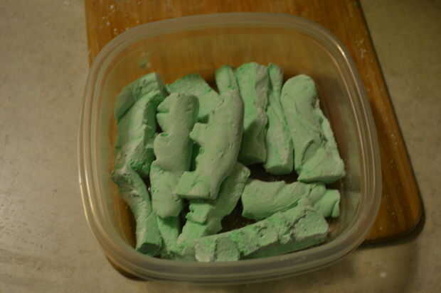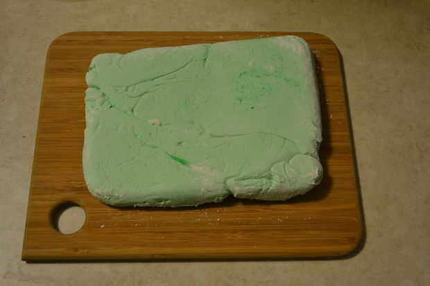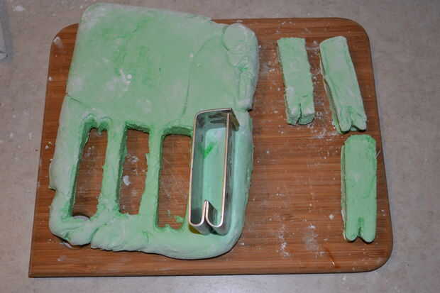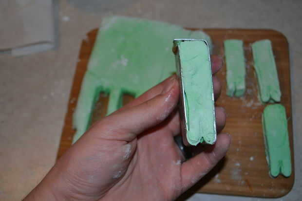 Utilice la herramienta de corte al igual que un cortador de la galleta, presionando hacia abajo con el malvavisco. Tire el exceso fuera de los bordes antes de quitar la herramienta de corte. Un poco de presión en la cuchilla ayuda a evita escapar lágrimas. Cuando cortar la enredadera se retira ligeramente los bordes recién cortados del polvo con el polvo para evitar que se pegue. Repita hasta que no hay margen izquierda para obtener un corte completo en.