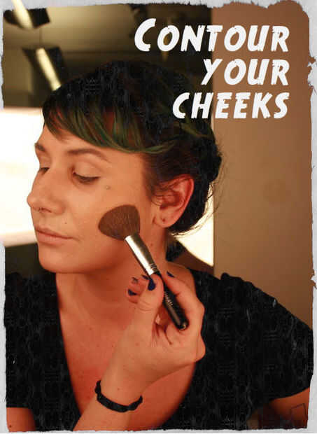 Usando un polvo bronceador mate/del contorno o crema o líquida Fundación varios tonos más oscuros que tu piel, contorno de los huecos de tus mejillas. Luego barrerlo hacia arriba alrededor de las manzanas, darse la ilusión de mejillas perfectamente redondas. Echar un corrector un tono o dos más claro que tu piel y, siguiendo el contorno, usan para resaltar sus mejillas y sus undereyes.