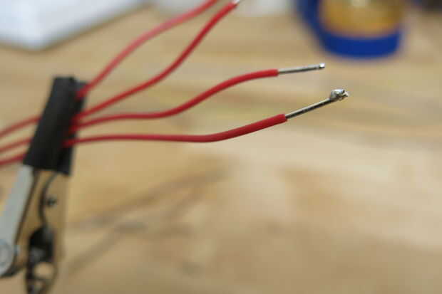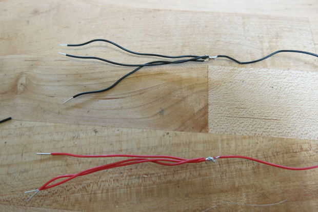 Lugar de la soldadura un poco en las puntas de los cables rojos y negros corto. También poner una pequeña soldadura en el extremo de los cables rojos y negros ya. Luego, soldar los cables cortos 3 al 1 alambre largo del mismo color. Cuando usted soldar todos los cables entre sí, la soldadura poco que agregó a los consejos ayudará a mantenerlos Unidos.
